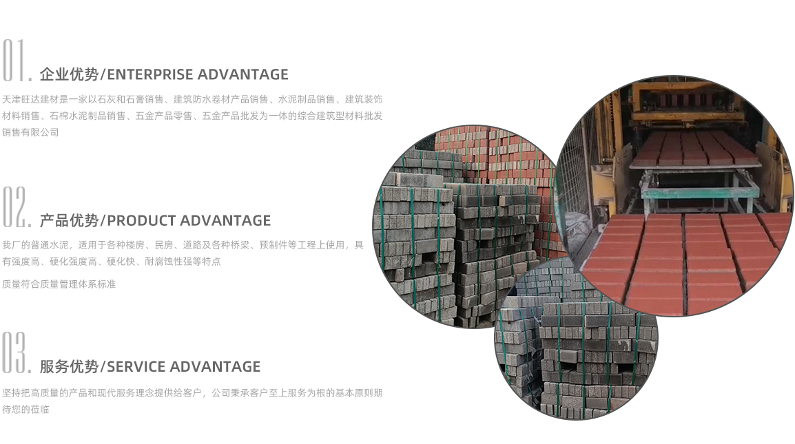 天津旺達建材是一家以沙子,水泥,加氣塊,加氣磚,面包磚,石灰和石膏銷售;建筑防水卷材產品銷售;建筑裝飾材料銷售;石棉水泥制品銷售;五金產品零售;五金產品批發為一體的綜合建筑型材料批發銷售有限公司,公司秉承客戶至上服務為根的基本原則期待您的蒞臨。作為專頁的建材生產企業,我們為您提供優良的天津沙子、天津水泥和天津面包磚,肯定能滿足您對建筑材料的需求。我們天津沙子廠家的沙子粒度均勻,適用于各類建筑項目,從住宅到大型商業工程,都能確保工程質量的堅固與耐用。我們天津水泥廠家生產的高強度水泥,經過嚴格的質量控制,不僅具備很強的粘合力,還擁有優異的耐久性,能夠適應各種復雜的施工環境,保障建筑結構的穩固。我們天津面包磚廠家生產的面包磚系列更是以其美觀、環保、耐磨的特性,廣泛應用于城市道路鋪設、園林景觀建設等項目,提供持久的美觀與功能性。我們堅持綠色環保理念,所有產品均通過嚴格的環保檢測,力求為您提供相對高...